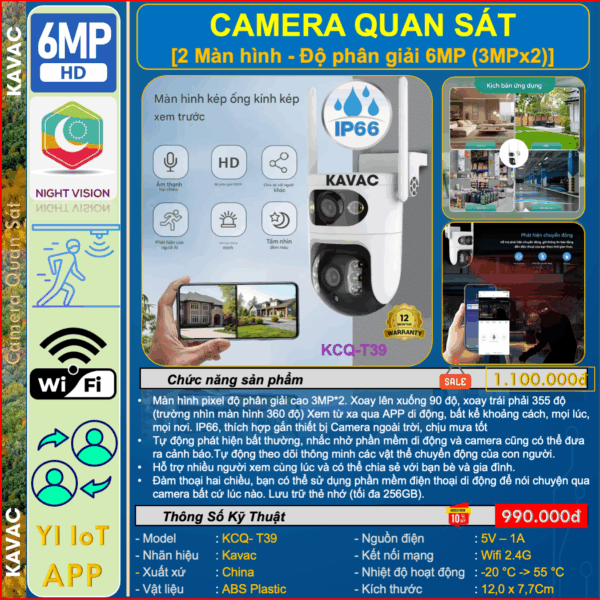 3.4 Camera Kép 6MP Quan Sát, IP66- Ngoài Trời, Kavac – Model: KCA-T39